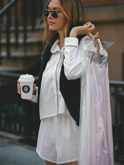 Inspired by the elegance of the Upper East Side, Le Classic Set in Park Ave embodies timeless refinement. Crafted in crisp cotton with luminous mother of pearl buttons, it brings a quiet sophistication to everyday dressing.